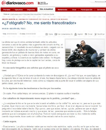 He tratado ser siempre autodidacta perfeccionando mi estilo, pero tuve que pasar por varios cursos profesionales hasta adquirir los conocimientos y experiencia para emprender el paso al terreno profesional. Aumenté mi equipo fotográfico y empecé a sacar fotografía de moda , books, bodas, calendarios ,circuitos y cualquier trabajo que se me solicitara. He trabajado con la Casa De La Rioja , Real Motoclub de Guipuzkoa, OmniaMotorTeam, Donosti Motor Team, Circuito de Navarra, Joe Racer Team, TMSR ,Negua, Cassiano By Rombo, Diario Vasco, Diario La Rioja, Diario de Navarra, Brioche pasquier, Artefoto, Estudio KB, Webs de viajes y un largo etc...Actualmente ejerzo la fotografía de forma amateur sin ningún tipo de compromiso porfesional. Si buscas un fotógrafo profesional para un evento o sesión fotográfica te puedo asesorar sobre compañeros especializados y profeionales. Ejemplos prensa: